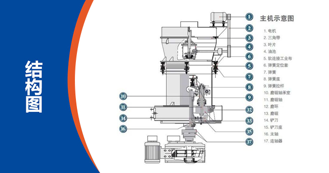 鋁礦石磨粉機內(nèi)部結(jié)構(gòu)比較簡單,主要由主機、電機、鼓風(fēng)機、分析機、管道裝置等幾部分組成,其中主機作為該設(shè)備的主要部件,又包括了磨輥、磨環(huán)、鏟刀、進風(fēng)蝸殼、機架、罩殼等。
